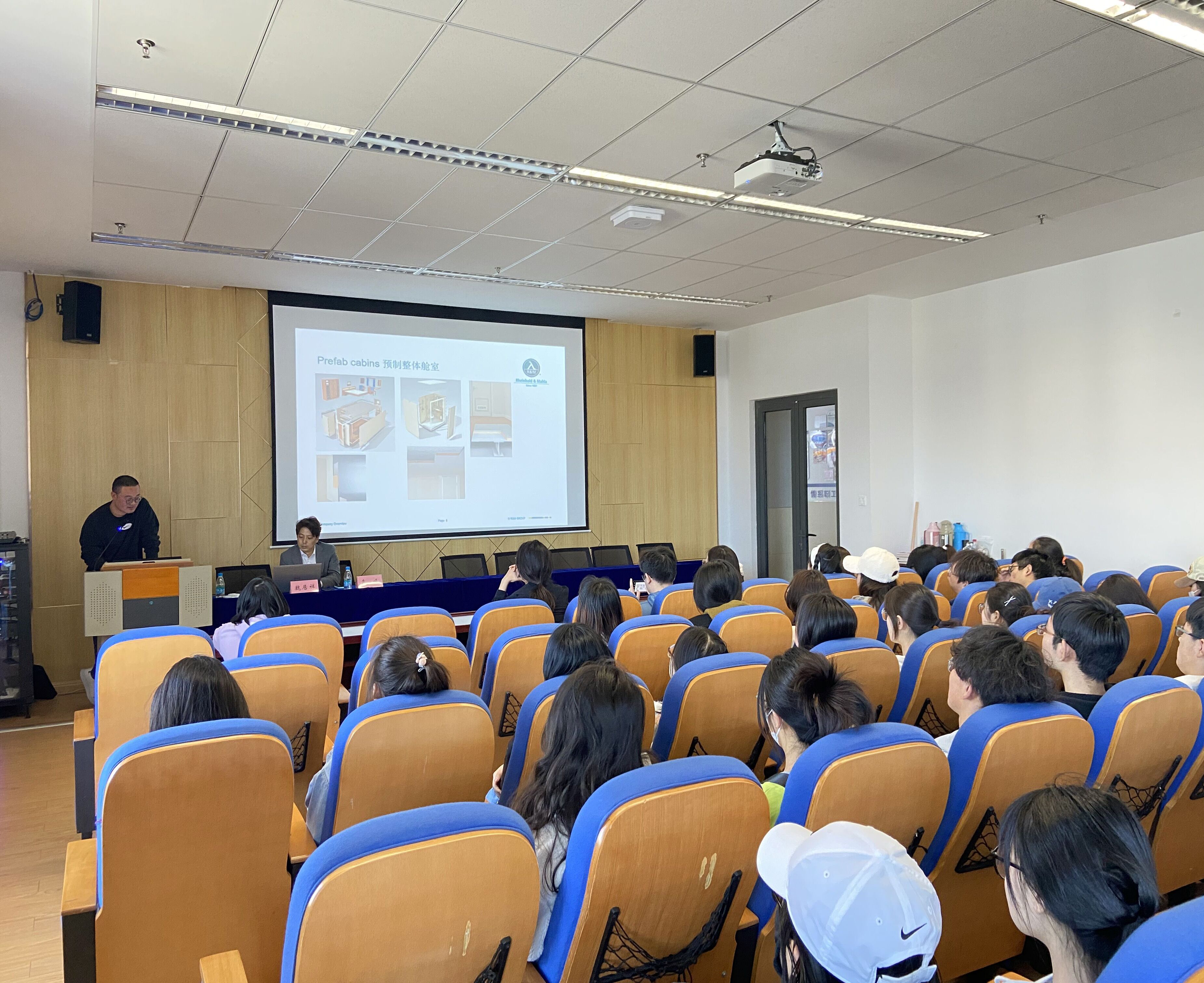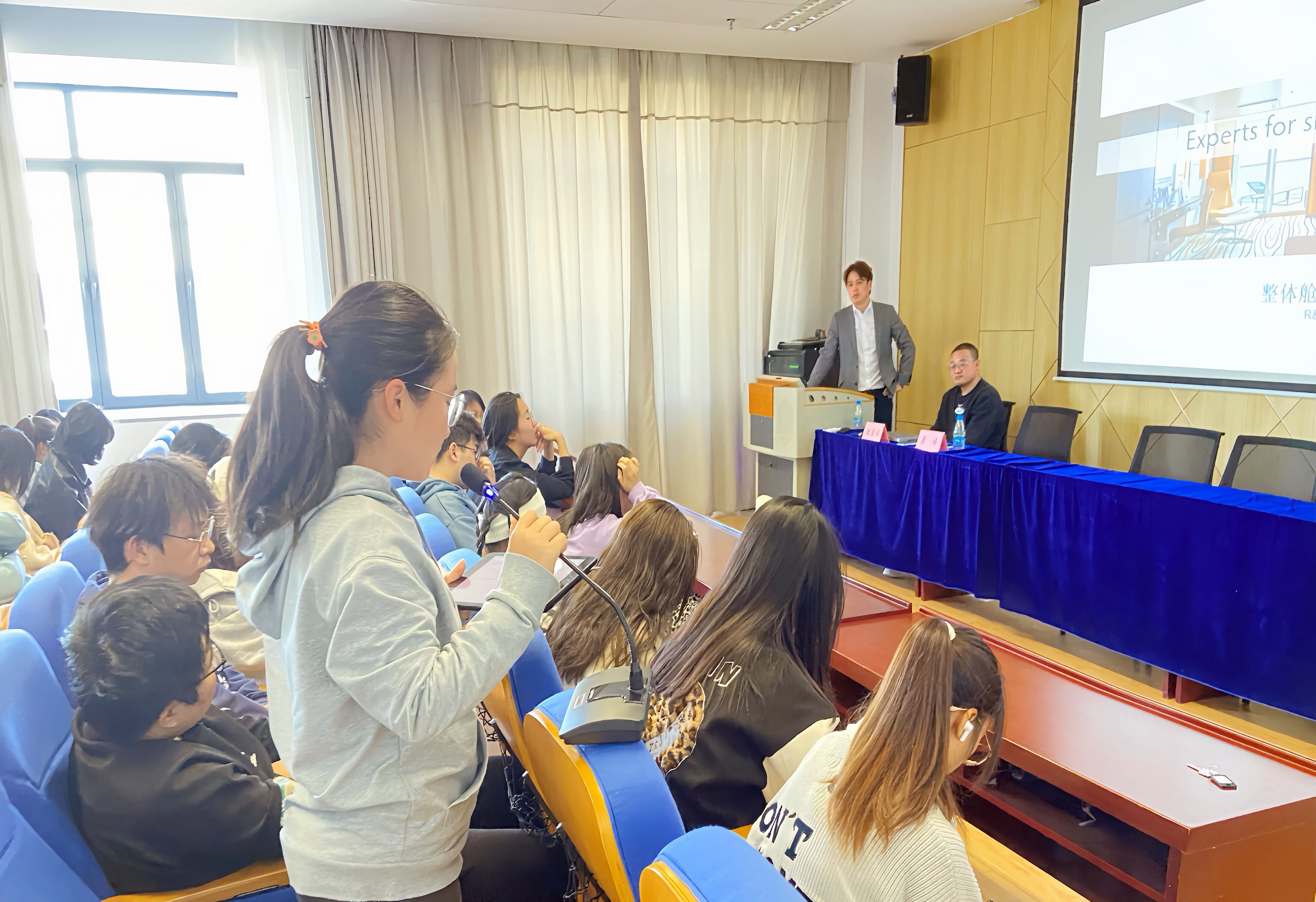 首先魏居祥以R&M公司的历史及发展现状为引,从国内邮轮内装产业发展现状和国内与国外邮轮内装产业发展现状的比较两个角度介绍了我国豪华邮轮产业的发展情况。接下来,魏居祥以两个实际落地项目为案例,为师生系统地讲解了邮轮内部装饰的设计原则,设计方法和注意点,特别强调了船上人机尺度与陆地建筑的异同点。第一个案例是传统邮轮的模块化内装单元,他向同学们说明了现代西方内饰建造的最新理念:预制整体舱室的概念和意义;第二个案例是“Smart Cabin”智能舱室前沿智能化设计理念的原型,强调智能不仅仅是智能终端,智能产品等单一的智能化,而是全舱室的、整船的、系统的智能化。最后的交流环节中,学生们踊跃提问,正在进行毕业设计的19级学生提出现有邮轮内装是否考虑到适老化的设计,如何将中式风格更好的融入设计中进而更易被用户接受等问题。魏居祥和袁峰从设计思路,设计方法,国际法规和标准等方面细致耐心地回答了同学们的提问。