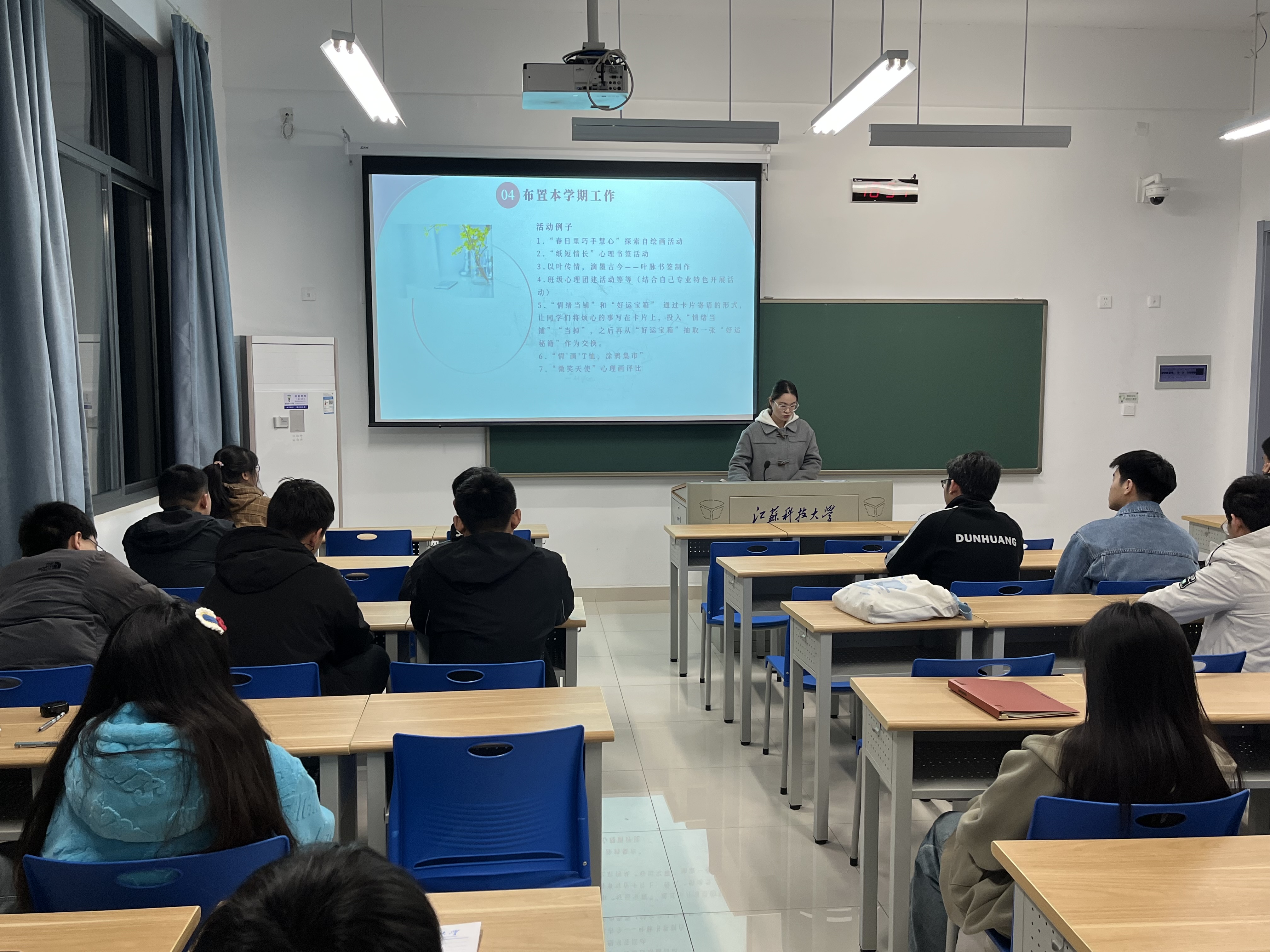 谭静首先宣布了本学年“重塑心秩序,青春再起航”大学生心理健康教育主题,提出了相关主题的大学生心理健康教育系列校级作品征集活动、第七届“世说新语”心理情景剧大赛院内选拔赛的要求,并给心理委员布置了任务。随后,对心理委员提出了三点工作要求:一是要积极发挥心理委员的主观能动性,形成主动观察、及时反馈的良好工作交流机制;二是要加强心理健康教育工作与班集体的联系,形成多元组织、共建共促的心理健康特色循环;三是要提升心理健康教育队伍的专业素养,以更好地主动协同、高效配合学校和学院开展心理知识普及宣传工作。希望各班级心理委员能够做到时刻与同学同在,及时发现问题,解决问题,维护心理健康,共创美好大学生活。