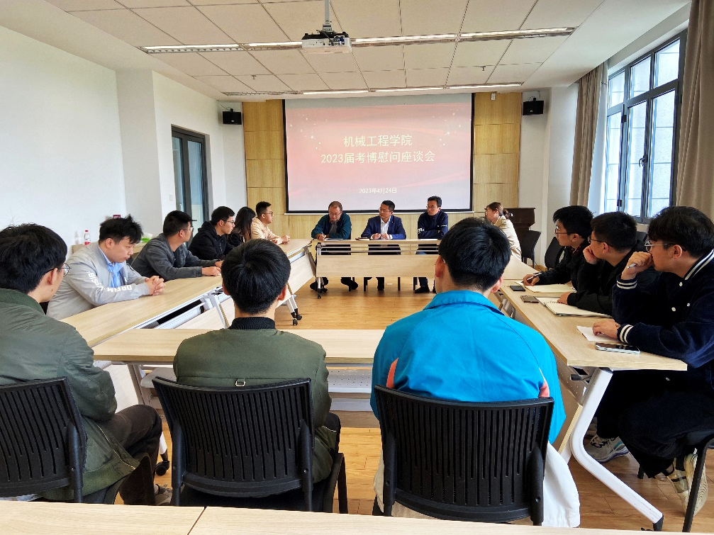 为不断提高研究生培养质量,激发研究生考博动力,指导研究生科学报考,木瓜视频 于4月24日在机械楼大会议室召开了考博慰问座谈会,木瓜视频 副院长(主持工作)张建,副院长李磊,党委副书记谭海波,研究生辅导员席娟、朱志贤及20、21级考博学生参加本次座谈会,座谈会由党委副书记谭海波主持。
