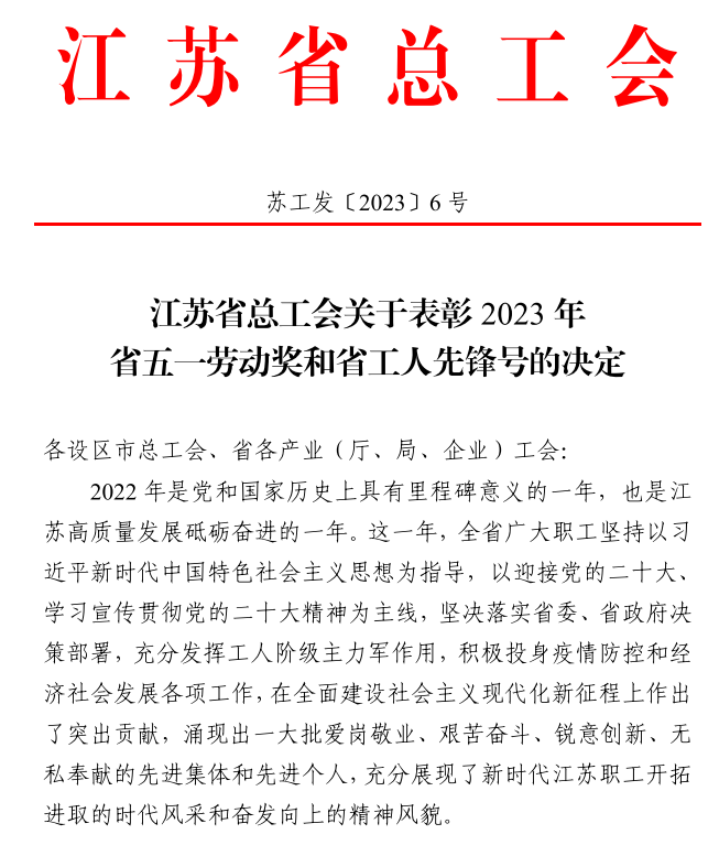 427日,江苏省总工会下发《关于表彰2023年省五一劳动奖和省工人先锋号的决定》(苏工发2023﹞6号)文件,对过去一年爱岗敬业、艰苦奋斗、锐意创新、无私奉献的先进集体和先进个人进行表彰。我校木瓜视频 被评为“江苏省工人先锋号”。