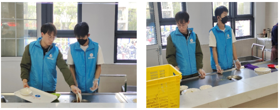 本次活动人员分为两组,分别负责一楼和二楼的餐具回收,义工们按照食堂阿姨的要求,把剩余的饭菜倒入规定的垃圾桶中,把碗筷放入黄色回收篮子里,并把地面上的饭粒、残渣与垃圾清理干净,在活动中,义工们不怕苦、不怕脏,用心服务好每一位同学,同时也深刻体会到了“锄禾日当午,汗滴禾下土;谁知盘中餐,粒粒皆辛苦。”的深刻含义。