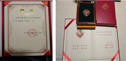 在部队服役5年间,龚本因工作突出,共计获得3次嘉奖,一次被评为优秀义务兵,一次被评为“四有”优秀学员,并于2022年荣立个人三等功。军校三年间,龚本也收获满满,共计获得国家级竞赛奖2项,军队级竞赛奖2项,省部级竞赛奖3项,院校级竞赛奖17项;在解放军报、中国青年报、人们陆军报、“烽火陆勤”微信公众号等主流媒体共计刊稿30余篇,并因完成工作出色被特聘为陆军勤务学院融媒体中心编辑。对于这些荣誉,他这样说道“荣誉代表组织对我的认可,但我要继续努力,戒骄戒躁。”