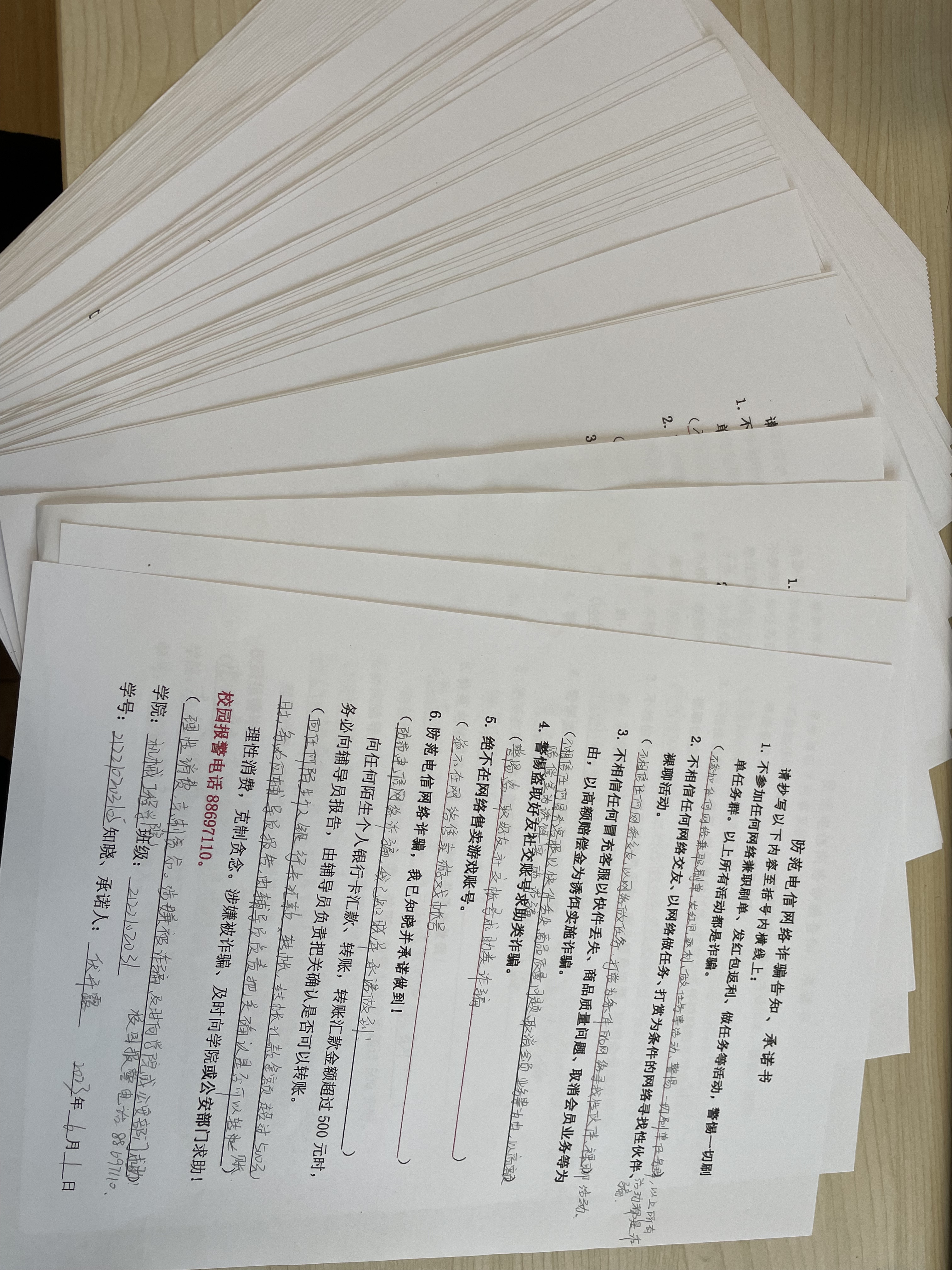 在班会的最后,辅导员李文达老师要求同学们签署防范诈骗的承诺书。这份承诺书不仅是对自己和家人的一种保障,更是对整个社会的一份贡献。通过共同努力,我们可以建立一个更加安全和稳定的社会环境,让每个人都能够享受到真正的幸福和安宁。