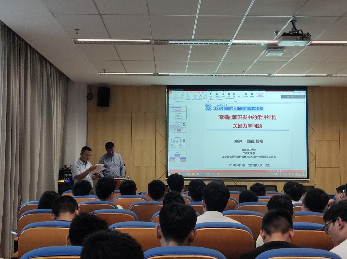 会上,阎军教授详细介绍了深海能源开发中的柔性结构关键力学问题以及最新研究进展,并对师生提出的“如何提高脐带缆接口密封性能”等问题做出了详细的解答,获得了师生们的阵阵掌声。
