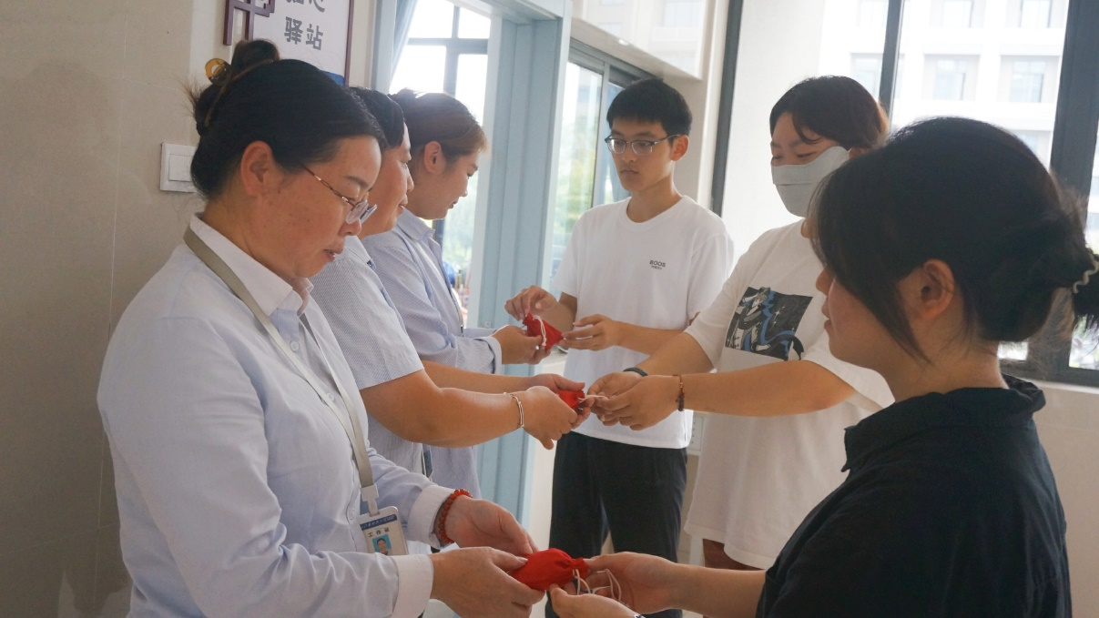 图为志愿者将香囊赠予宿管阿姨 马灿坤摄