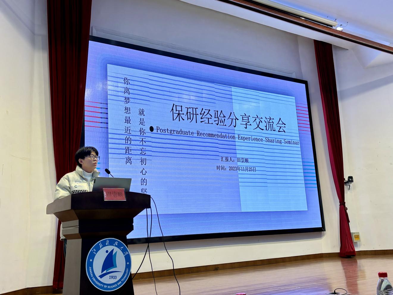 田崇顺学长结合自身成功保研西安交通大学的经历,给同学们分享了干货满满的保研经验。他从何为推免、保研流程、前期准备三个方面为同学们讲解了保研需要准备什么资料,学好什么知识,参加哪些竞赛或实验项目。另外他还建议同学们主动了解政策,全面获取信息,以平和的心态合理的规划好大学生活,做到全面发展。最后他结合自身发展的经历,为同学们提供了一份从大一到大三的详细参考规划,他建议学弟学妹们在大学期间要积极主动,提早做规划,寻找适合自己的学习方法,坐得住冷板凳,耐得住寂寞心。