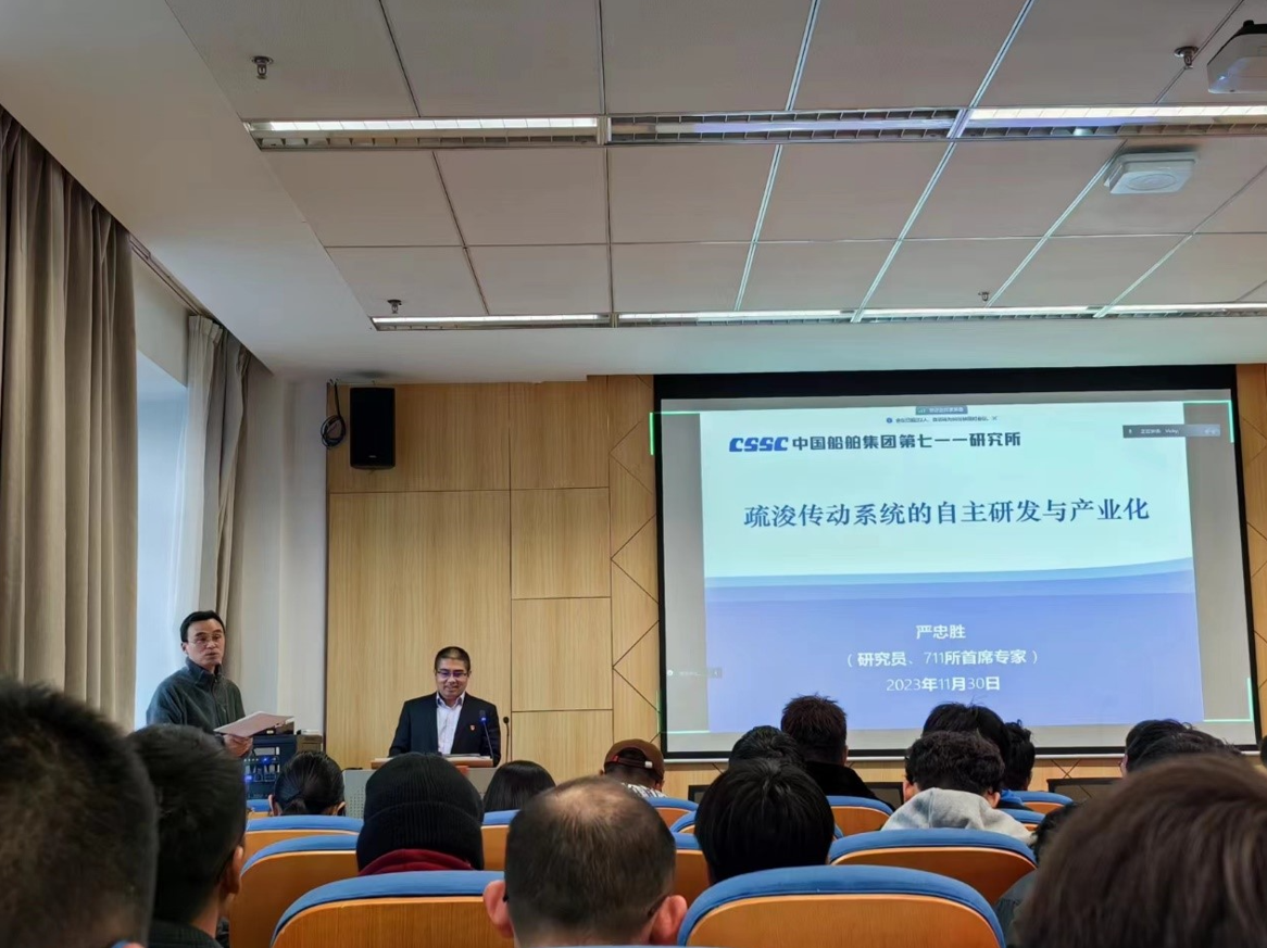 2023年11月29日,711所首席专家严忠胜应邀以“疏浚传动系统的自主研发与产业化”为主题做了精彩讲座。木瓜视频 副院长李磊主持本次讲座,木瓜视频 部分青年教师、研究生在学院426学术报告厅或在线参加了讲座。