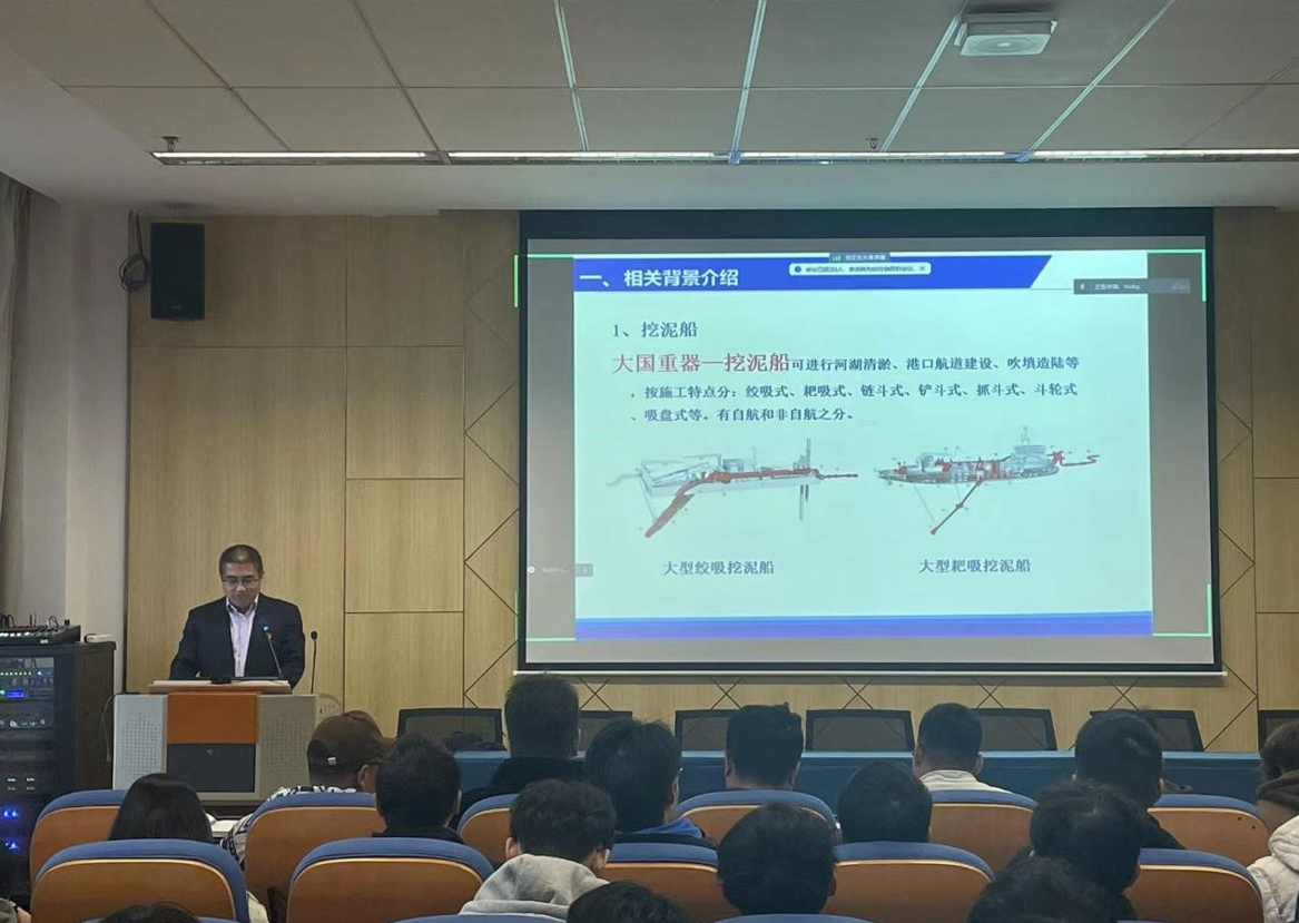 严忠胜研究员首先介绍了疏浚传动系统的自主研发与产业化所取得的成就并重点讲解了大国重器—挖泥船。接着,严忠胜研究员针对挖泥船施工特点,着重介绍了大型绞吸式挖泥船的挖掘能力、淤泥的搬运和处理、绞吸装置的维护及检修等几大技术挑战。最后,严忠胜研究员总结了项目成功所需的经验和关键技术点,并展望了大型挖泥船未来发展方向,鼓励师生们积极参与科学研究,为目前的“卡脖子”问题研究作出贡献。