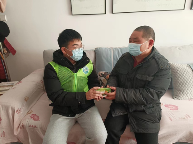 团队成员金少楠同学回到家乡,开展送药上门服务,用暖心的服务为老人们筑起一道健康防护墙。了解部分独居老人情况后,团队成员金少楠同学和乡村医务工作者将退烧药、感冒药等应急药品递到了老人的手中,并耐心向其讲解每种药品的服用方法以及注意事项。老人子女定居外地,独自居住,收到这份温暖关怀,老人格外感动。