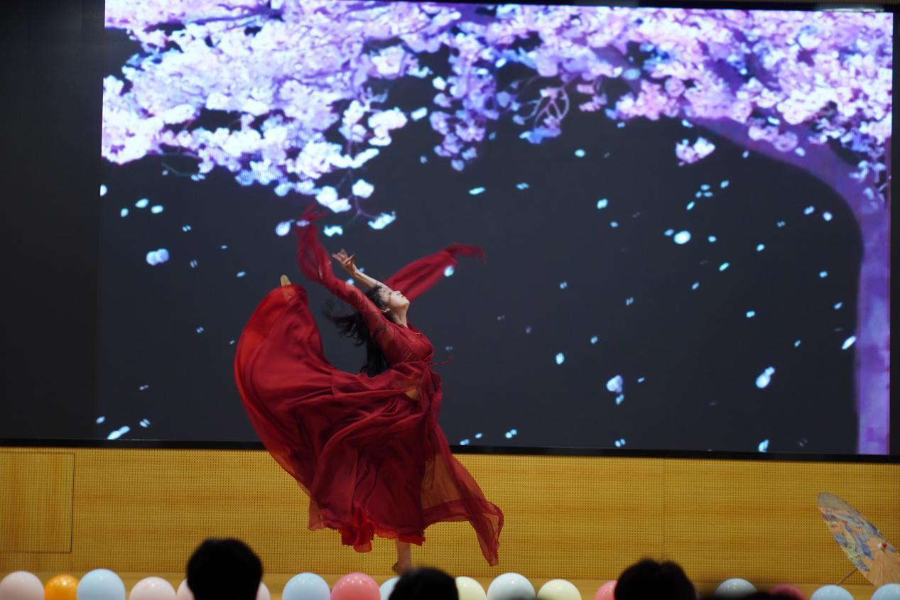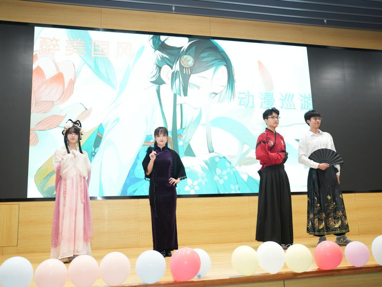 短暂的娱乐过后现场再次切回正题。《醉美国风,动漫巡游》节目中来自动漫社的同学们以精美造型,搭配灵动的表演、轻快舒畅的背景音乐以及精心准备的互动,使现场的同学们眼前一亮,国风和动漫的碰撞所创造出的活力将现场的气氛再次推向高潮。在如此热烈的氛围烘托中,大艺团的秦续侨同学踏着悠悠国风音韵《初见》登上舞台,典雅的韵律伴着她的翩翩舞姿好像把观众拉进与刚刚截然不同的一个世界,但随着音乐的不断加强,她的动作也越发舒展婀娜,引得台下爆发阵阵掌声,再一次成功点燃观众的热情。