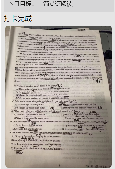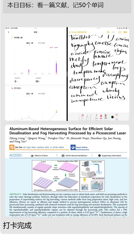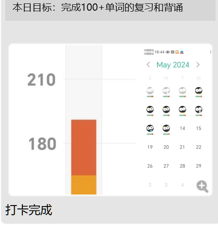 在活动启动的第一天,早就加入“打卡群”的同学们就已经按捺不住心中的热情,争先制定每日计划目标,“今日目标跑步四公里”、“今日目标学习100英语单词”、“今日看一篇高质量文献”...学校的体育馆,湖畔边,图书馆,都可以看到他们积极实现目标而努力拼搏的身影,“打卡群”内完成每日目标的信息也纷至沓来。