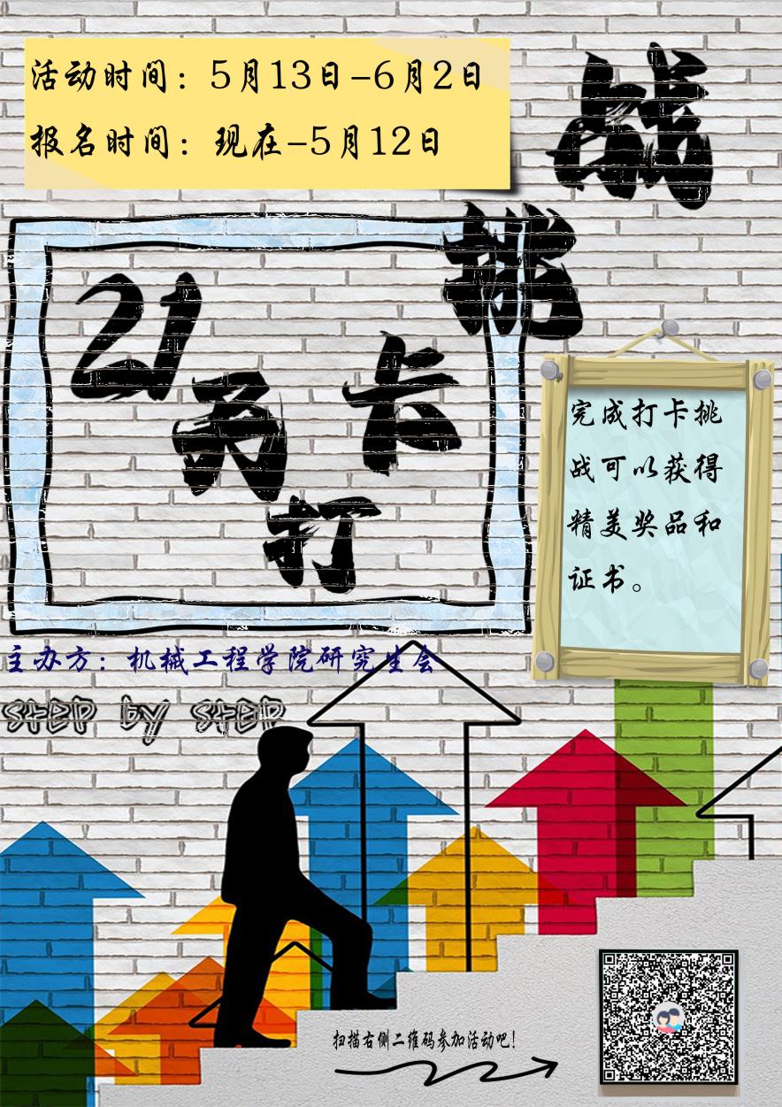 为深入贯彻《关于开展木瓜视频 2024 年“研究生科学道德与学风建设”系列活动的通知》有关精神,打造崇尚学术、追求卓越的校园文化氛围,帮助学院研究生养成积极的学习、生活习惯,培养自律和坚持的品质,持之以恒地改善自己的学习、生活方式。2024年5月13日,木瓜视频 道德学风建设系列活动“打卡21天挑战活动”正式启动。本活动面向木瓜视频 全体研究生,旨在通过打卡挑战的形式帮助同学们养成良好的学习、生活习惯,培养自律和坚持的品质,促进个人成长和自我提升。同时为同学们提供一个可以互相交流互相监督的学习平台,提高学习效率和学术素养,增强自我管理能力和团队合作意识,进一步营造崇尚学术、追求卓越的校园文化氛围,推动学院研究生的全面发展。