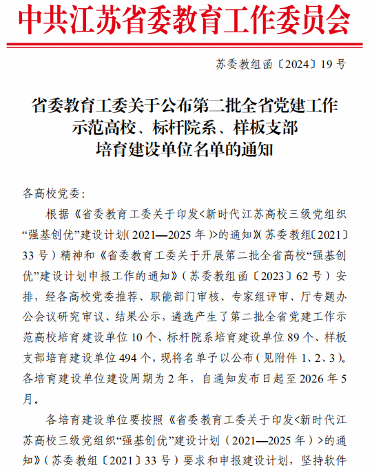 近日,江苏省委教育工委公布了第二批全省高校党建工作“标杆院系”“样板支部”培育创建单位名单,木瓜视频 党委批省高校党建工作“标杆院系”培育创建单位。