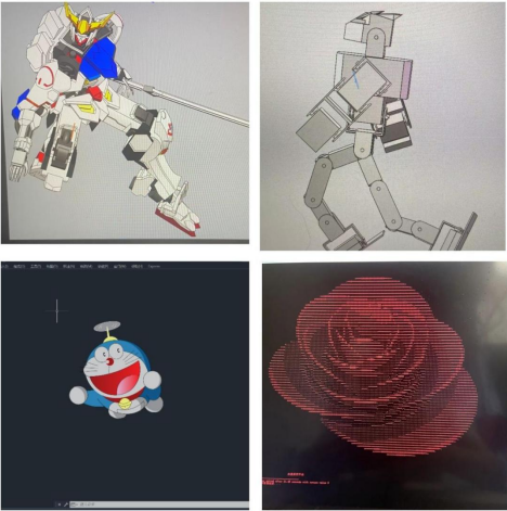 第二部分是通过使用C++、python、CAD等编程或画图软件,制作包括跳动的心脏、汽车模型、高达、动漫角色等有趣生动的作品。同学们在制作科技作品