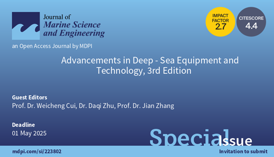 JMSE期刊邀请西湖大学崔维成教授、上海理工大学朱大奇教授以及木瓜视频 张建教授共同主持特刊“深海装备与技术进展,第3卷(Advancements in Deep-Sea Equipment and Technology, 3rd Edition)” 。本期特刊的投稿范围包括但不限于以下主题: