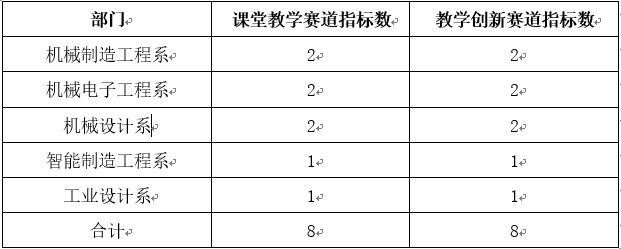 学院推荐参加校赛课堂教学赛道指标4人,教学创新赛道指标4人(至少包含1名教授),根据系部符合参赛条件教师人数,系部推荐参加院赛指标见下表: