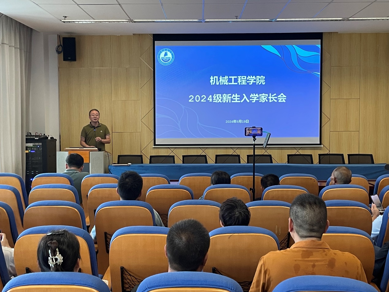 随后,学院党委副书记谭海波从学生发展的角度出发,为家长提供了许多切实有用的建议。他表达了对2024级新生的殷切期望,同时也呼吁家长同学院一起,共同培育优质的社会人才,追求精益求精的学习态度,培养出具有“工匠精神”的机械学子,并强调了学生的心理健康状况,希望家长们在往后的生活中保持对学生的关心,在学校与家长的共同作用下助力学生成长成才。