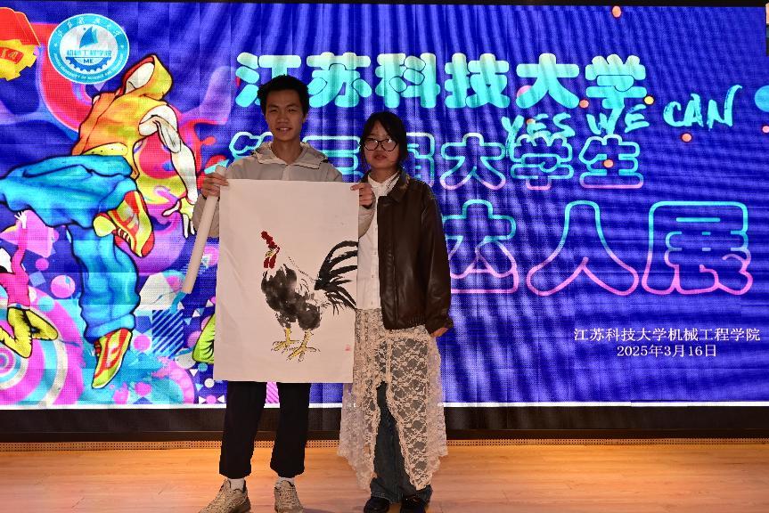 精彩的节目一个接着一个呈现在同学们眼前,穿插其中的抽奖活动更是激动人心。在大家的欢呼声中主持人陆续公布了获奖名单,幸运儿也面带欢喜地拿着国画与作品作者合影。