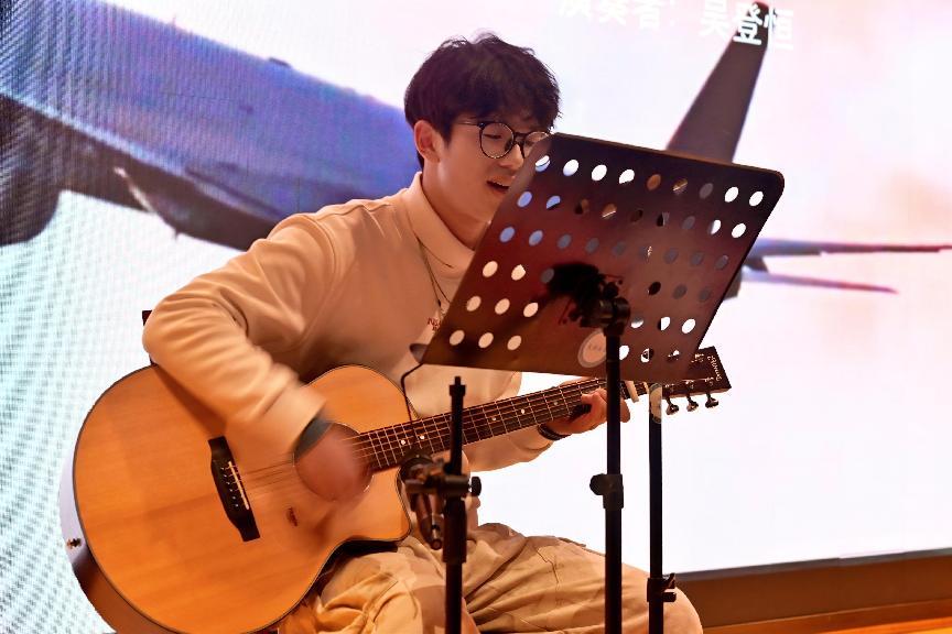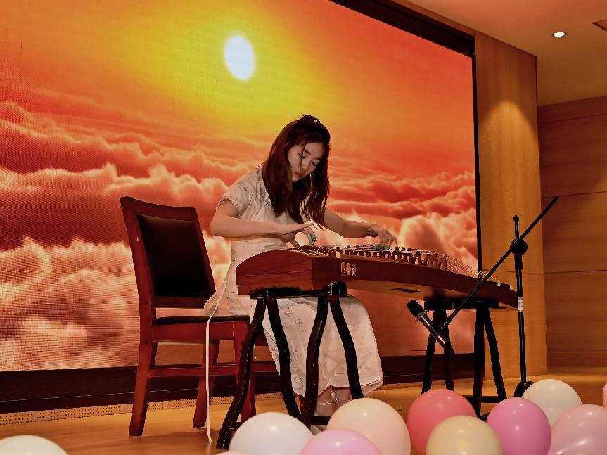 在激昂的英文歌后的是何梦婕同学的《象王行》,悠扬的琴声从指间传出。何梦婕同学的演奏层次分明,时而以疾速的扫弦展现大漠孤烟般的恢弘气势,时而又以细腻的轮指勾勒出流水潺潺的婉约意境,仿佛在诉说中华文明千年积淀的智慧与气魄。