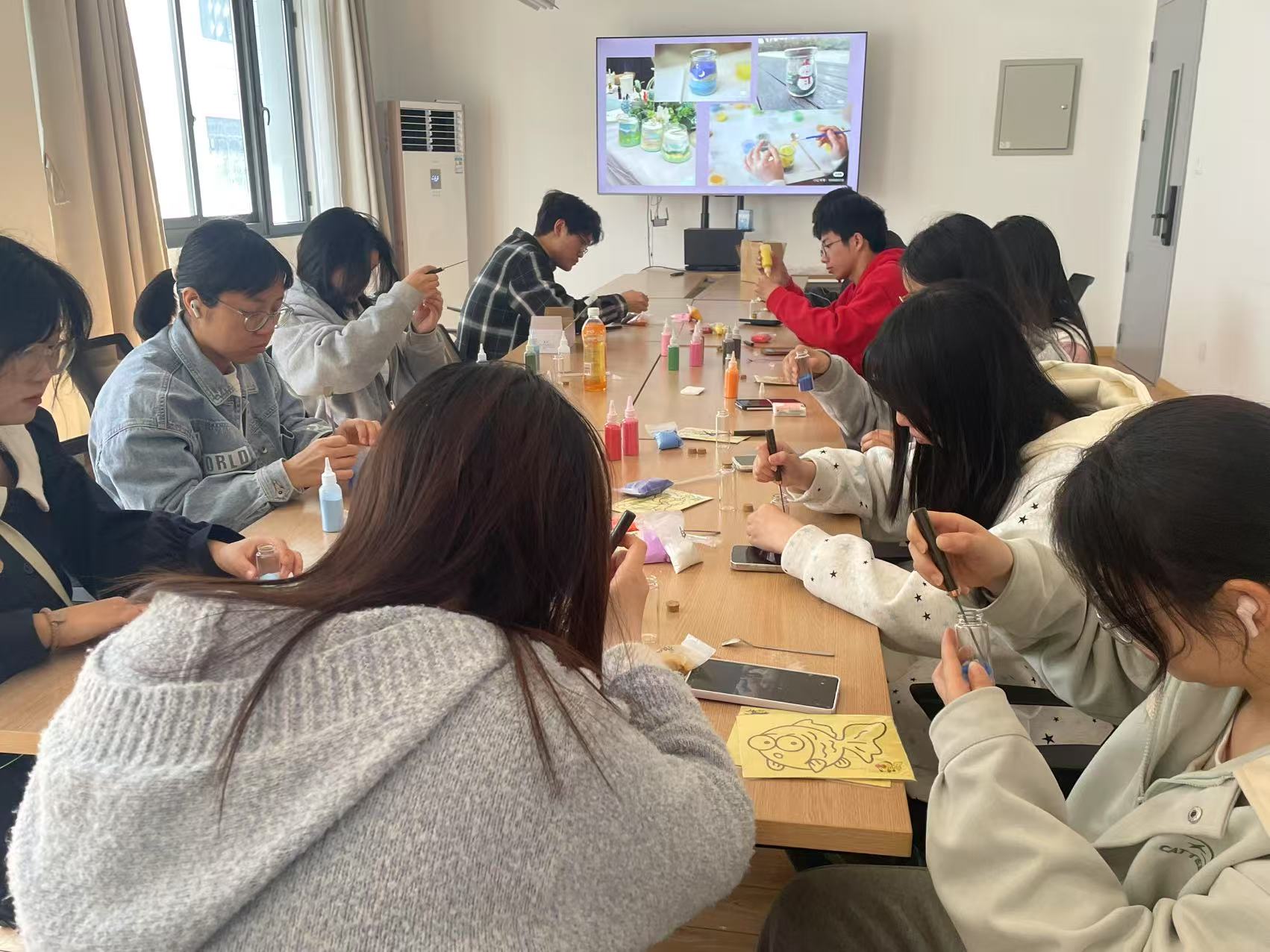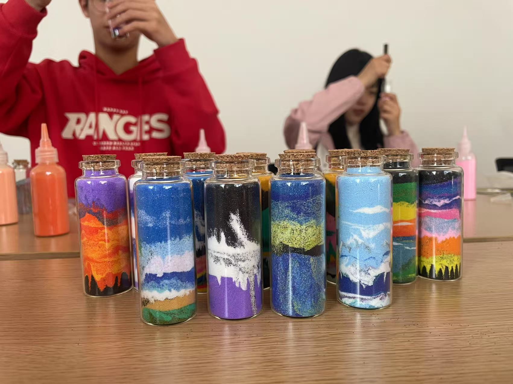 活动现场,同学们通过"选色-构思-绘制"将五彩细砂分层注入透明玻璃瓶内。以沉浸式创作的方式将近期的学习压力、情感困惑转化为具象化的艺术表达。机制专业的王同学分享创作感悟:"当指尖流动的彩砂在瓶中定格成情绪画卷时,那些困扰我的焦虑突然变得具象可感,完成作品后心情豁然开朗,仿佛完成了一次心灵SPA"