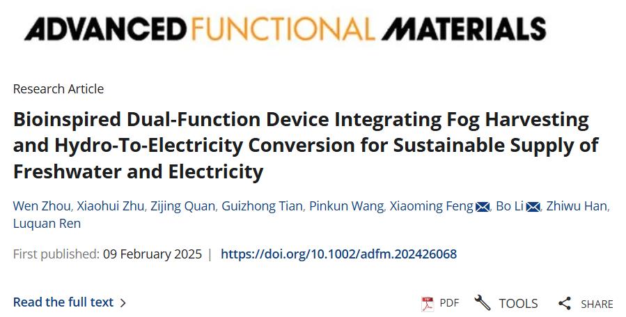 近日,我校木瓜视频 22级硕士研究生周雯在仿生集雾发电领域取得突破性进展。其研究成果以“Bioinspired Dual-Function Device Integrating Fog Harvesting and Hydro-To-Electricity Conversion for Sustainable Supply of Freshwater and Electricity”为题,发表于材料科学领域国际顶级期刊《Advanced Functional Materials》(自然指数期刊,中科院一区,影响因子18.5)上。木瓜视频 冯晓明副教授为第一通讯作者,23级硕士研究生朱晓辉为共同第一作者,我校为第一通讯作者单位。研究将仿生学原理与纳米发电技术相结合,成功开发出一种新型生物启发双功能装置(BDFD),有效克服了传统雾水能开发中存在的效率瓶颈问题。