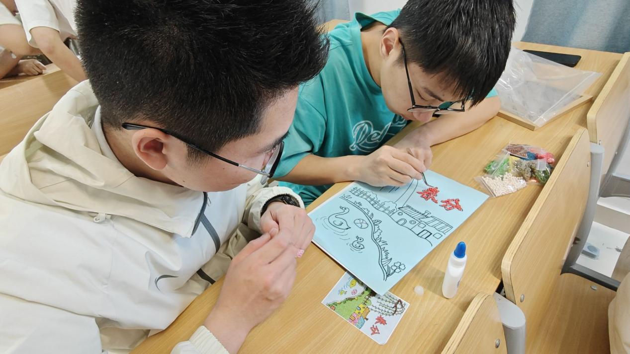 在讲解过后,志愿者把准备好的粮食作画材料包分发给每一位参与者。同学在拿到材料包后,也迫不及待地开始动手实操。材料包中有多种谷物,对应的有多种色彩,同学们通过所给的模板,结合自己的创意让一粒粒谷物焕发生机。看似简单的一幅画,实际动起手来却需要很多的细心和专注。在同学们粮食作画时,志愿者在一旁为有疑问的同学提供帮助。随着一幅幅粮食画的完成,同学们的脸上也逐渐浮现出成就感满满的笑容。