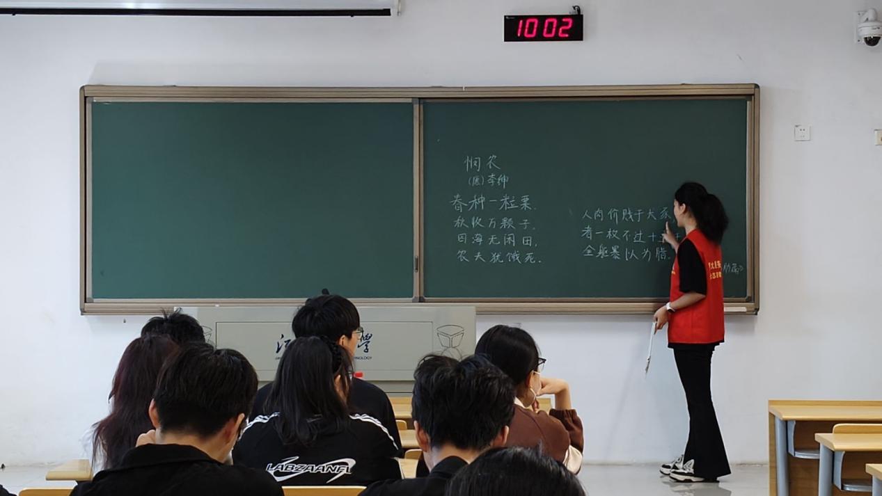 活动伊始,志愿者首先以富有感染力的语调,向台下的同学们娓娓介绍粮食作画的历史背景和节约粮食的相关知识。将古诗文与历史故事相结合,用李绅的《悯农》诗句串联古代农耕故事,那朗朗诗句仿若时光隧道的钥匙,将大家带回到古代农耕社会的艰辛岁月,让参与者们直观感受到古时粮食生产的不易。