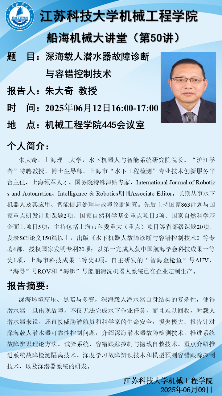 学术报告——深海载人潜水器故障诊断与容错控制技术