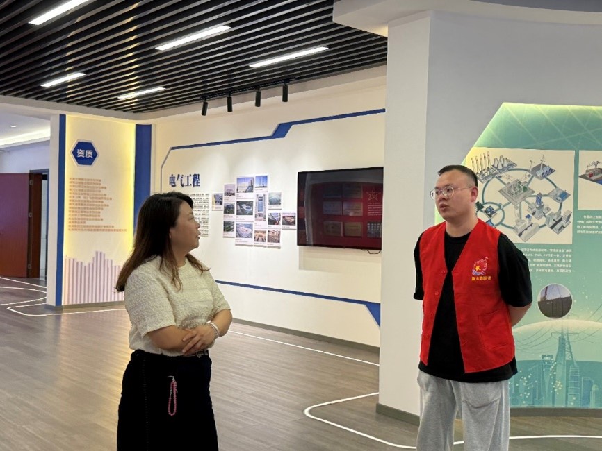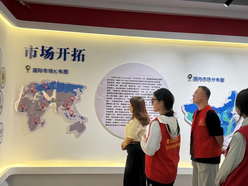 江苏镇安电力有限公司人事部朱主任向实践团队介绍了公司近年来在“走出去”战略中的典型案例,详细展示了镇安电力在“一带一路”沿线国家的重要项目布局。随后,成员们来到“市场开拓”展区,围绕国际合作与市场发展这一板块进行深入参观。实践团成员在现场认真记录市场图谱与合作案例,并围绕企业出口产品类型、海外工程配套能力等方面提出了具有专业性的提问。