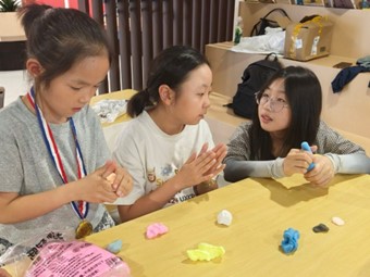 图为陈雨彤同学和小朋友们用粘土捏江豚