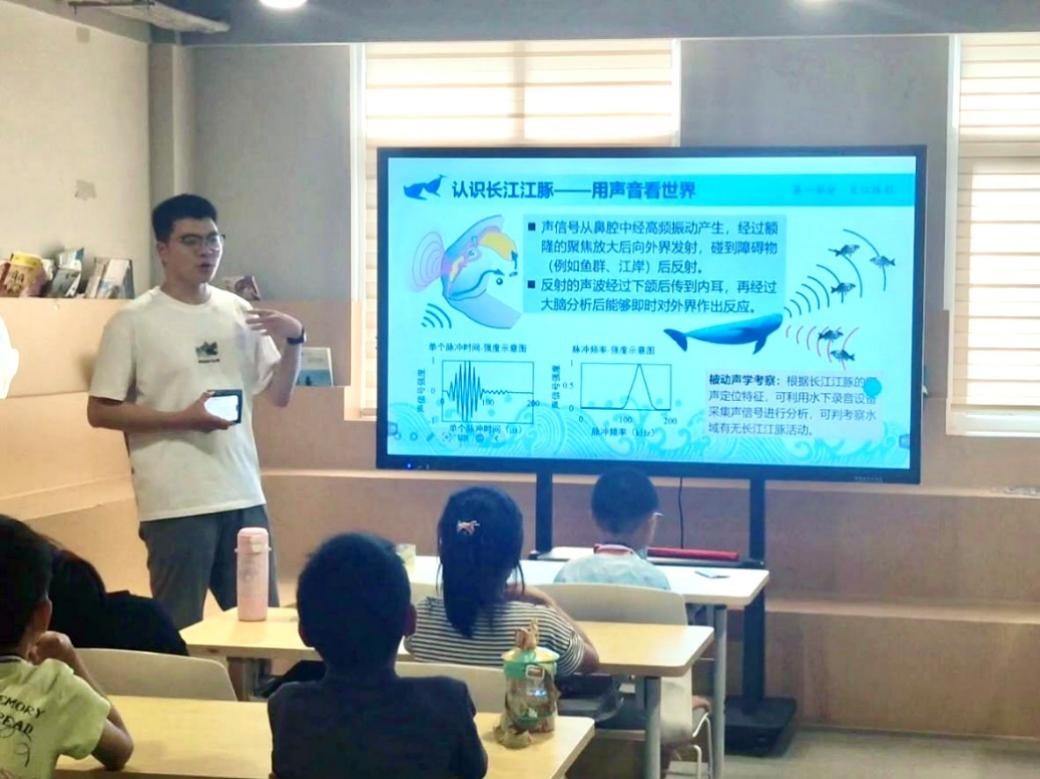 7月10日在江苏省镇江市镇江新区丁卯社区党群服务中心,志愿者们以“认识江豚”为主题展开了生动的讲解。他们通过精心准备的图片、视频资料向孩子介绍了江豚的外形特征、生活习性以及它们在生态系统中的重要作用。志愿者们用通俗易懂的语言,将江豚的故事娓娓道来,告诉孩子们江豚是长江里的“微笑精灵”,但如今它们的生存面临着诸多威胁,需要大家共同保护。孩子听得十分认真,不时举手提问,志愿者们都耐心地一一解答。