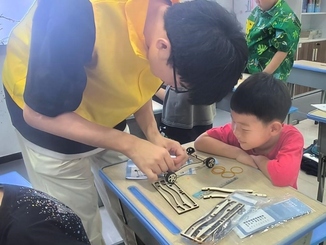 图为左逸润同学和小朋友们拼装模型小车