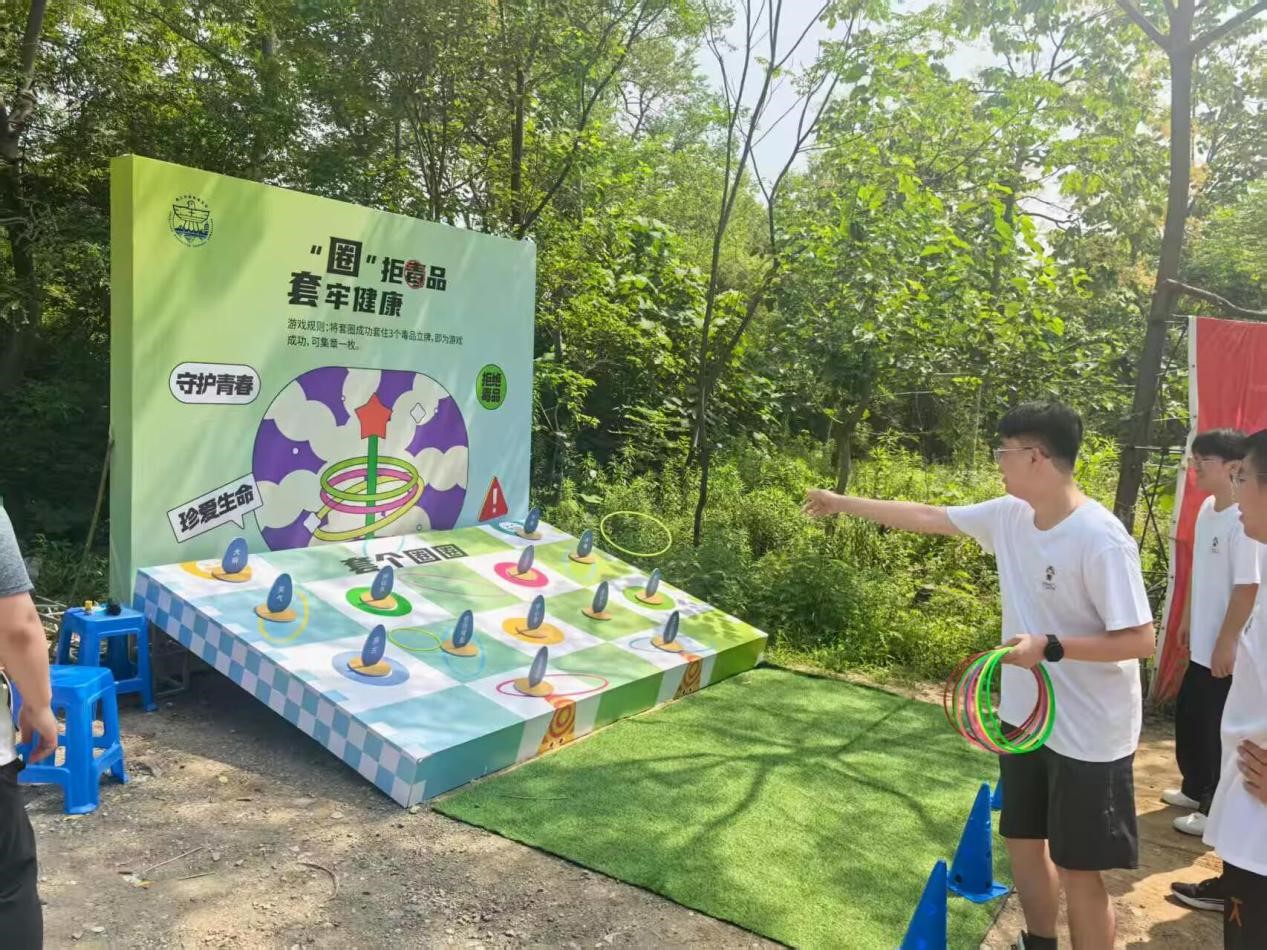 禁毒套圈区域摆放新型毒品的仿真模型,以及写着禁毒标语的展板。参与者需投掷套圈,套中目标获得对应的禁毒知识卡片。例如,套中“奶茶粉伪装毒品”模型,可通过卡片了解新型毒品的常见伪装形式。志愿者在旁同步讲解,让警惕毒品的意识深植人心。