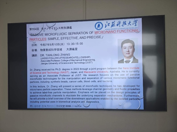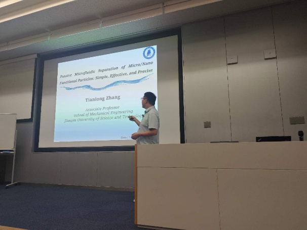 2025年9月10日,木瓜视频 张天龙副教授应邀赴日本奈良先端科学技术大学院大学开展专题讲座。讲座主题为“基于被动式微流控的微/纳米功能颗粒分离:简便、高效与精准(Passive Microfluidic Separation of Micro/Nano Functional Particles: Simple, Effective, and Precise)”。