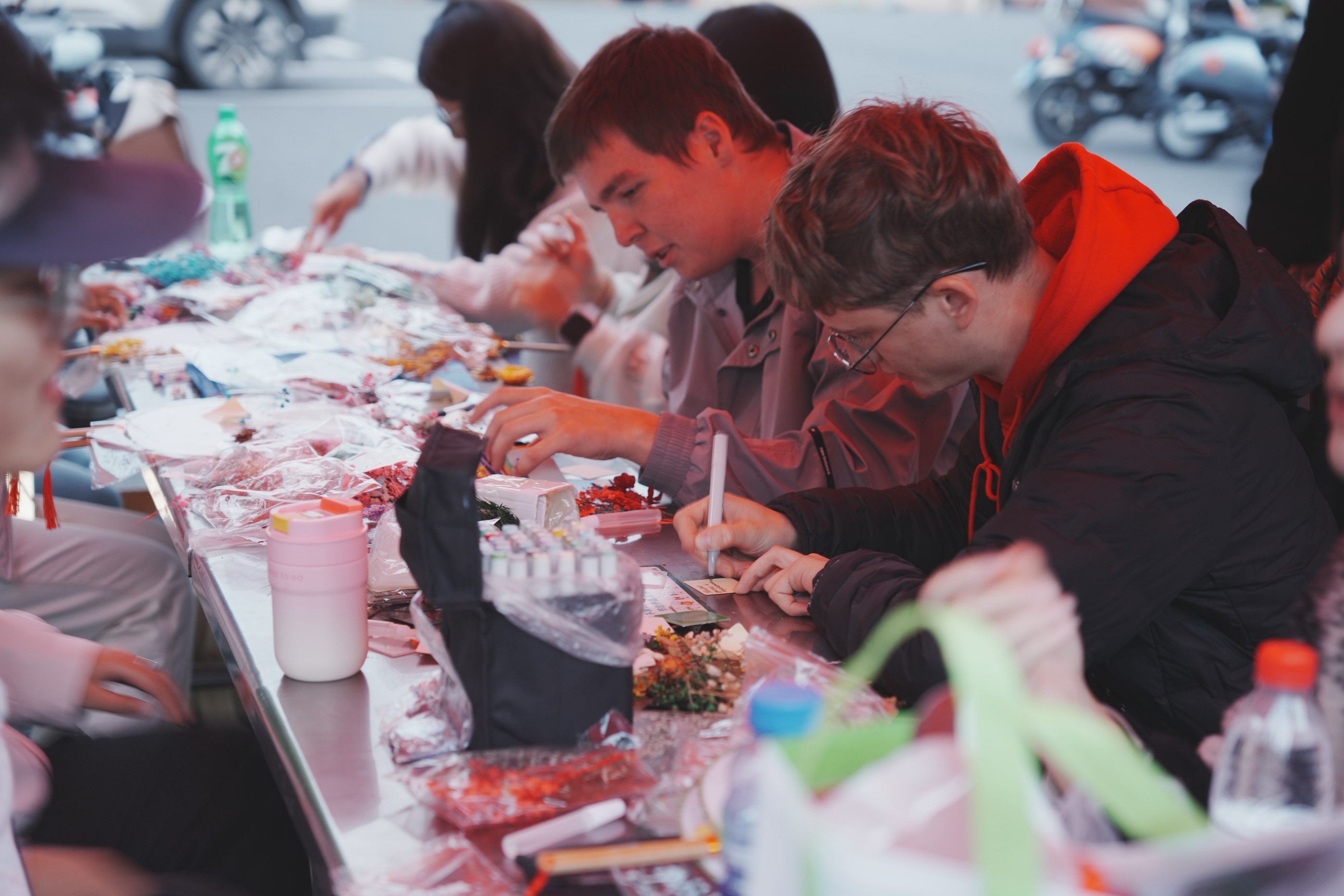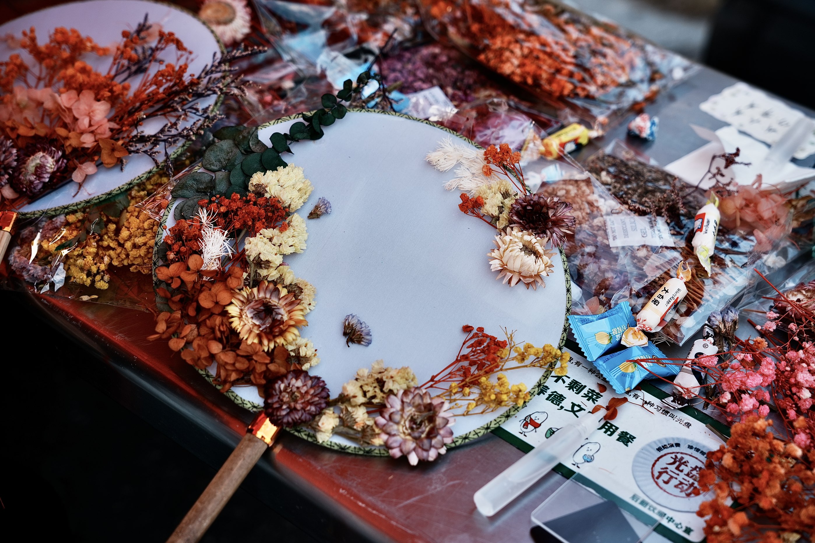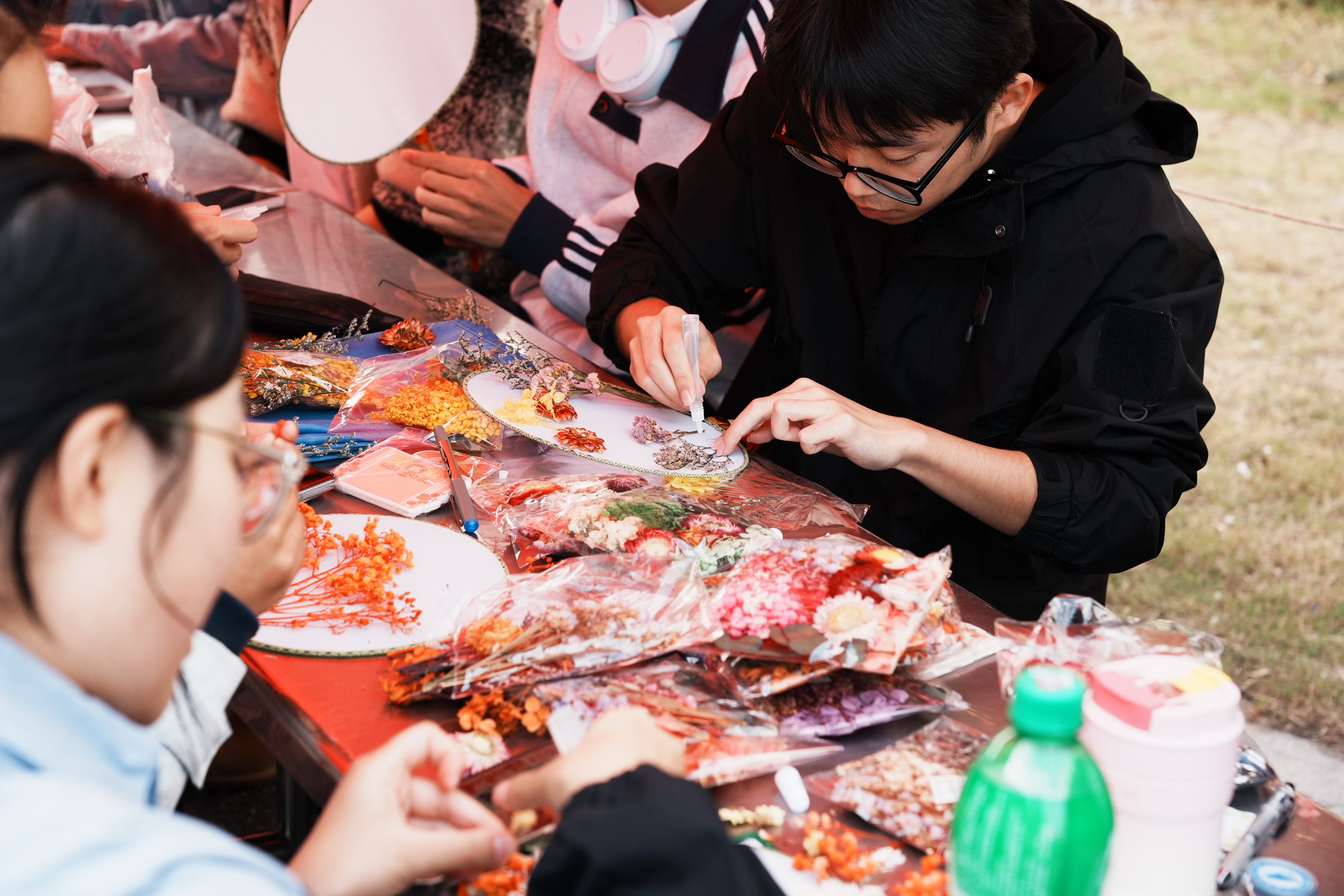 下午三时,活动正式开展,设置三大主题互动区域,吸引众多学子踊跃参与,现场洋溢着温馨热烈的校庆氛围。“裁作团扇,献礼校庆”区域,工作人员向学子介绍活动背景与参与方式,摊位备有干花材料包、团扇、胶水等物资。同学们在工作人员的指导下,亲手设计制作团扇,将美好祝福融入传统手作,献礼母校。